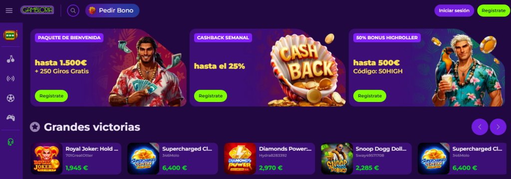 El Casino Gambloria se presenta como una plataforma moderna y atractiva, con un diseño intuitivo y un paquete de bienvenida muy competitivo de hasta 1.500 € + 250 giros gratis. Su catálogo de juegos es variado, abarcando desde tragamonedas clásicas hasta títulos en vivo de alta calidad, lo que garantiza entretenimiento para todo tipo de jugadores.