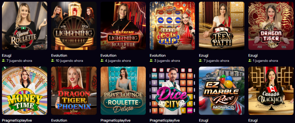 - Casino en vivo: mesas con crupieres reales de Evolution, Pragmatic Play Live y Ezugi (ruleta, blackjack, baccarat, game shows).
