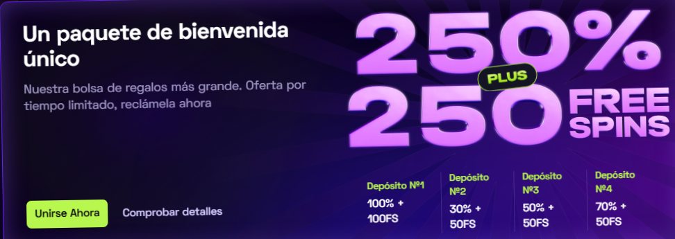 El casino ofrece un paquete de bienvenida del 250% hasta $4.000 + 250 giros gratis, repartidos en los primeros cuatro depósitos.