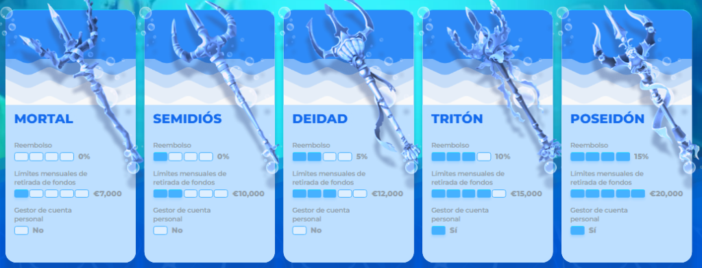 El sistema VIP se divide en cinco niveles, desde Mortal hasta Poseidón, cada uno con beneficios exclusivos diseñados para mejorar la experiencia de juego.