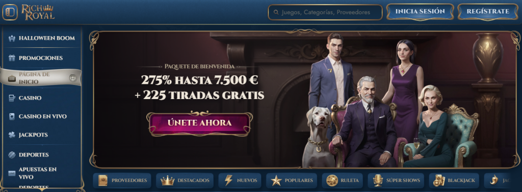 RichRoyal Casino destaca por su estilo elegante, su amplia variedad de juegos y sus atractivas promociones, especialmente el generoso bono de bienvenida del 275% hasta 7.500 € + 225 tiradas gratis + 1 Bonus Crab. La plataforma ofrece una experiencia completa tanto en versión de escritorio como en móvil, con un diseño moderno y tiempos de carga óptimos.