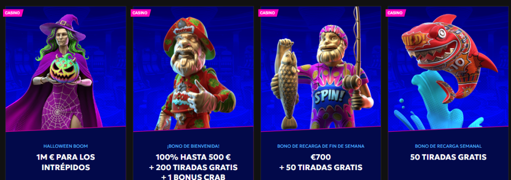 El bono de bienvenida ofrece hasta 1.000 € en 3 bonos, con requisitos de apuesta x30, además de tiradas gratis y promociones adicionales semanales.