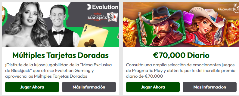 - Casino en Vivo: Blackjack, ruleta, baccarat y game shows con crupieres reales.
